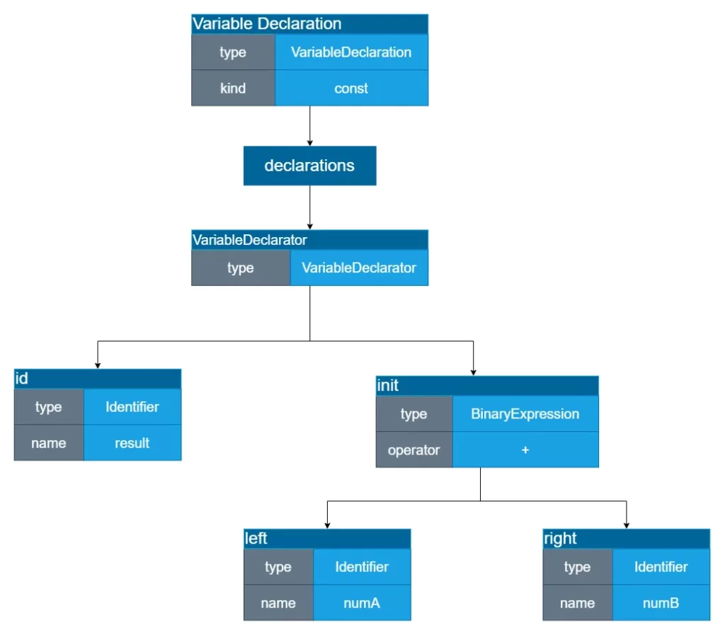 Esto es un ejemplo de lo que es un AST. Su utilidad por supuesto va más alla de solo representar código. También es la forma en la que un lenguaje de programación lo convierte a lenguaje binario. En Javascript este AST sería el objeto que nuestro compilador o interpretador estaría esperando para poder realizar dicha conversión.
